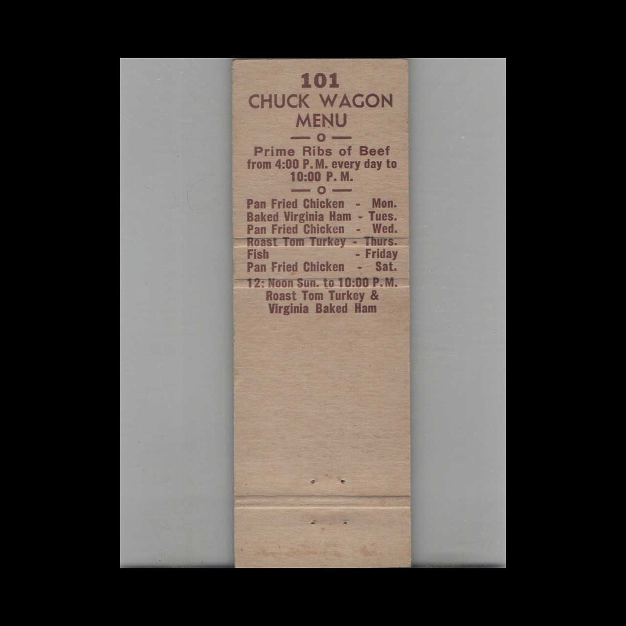 Midway Chuck Wagon Restaurant in San Diego, CA, offered classic Western dining with authentic cowboy charm. A nostalgic piece of Americana for vintage matchbook collectors.