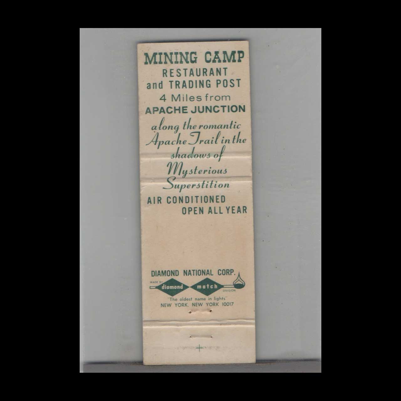 Discover the Mining Camp Restaurant in Apache Junction, AZ, a historic dining spot evoking the Old West spirit. A nostalgic piece of Americana for vintage matchbook collectors.