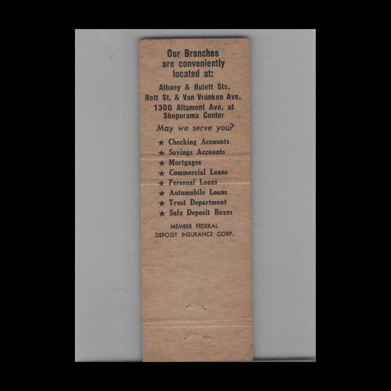Discover Mohawk National Bank of Schenectady, NY, a historic financial institution serving the community. This vintage matchbook is a nostalgic piece of Americana for collectors.