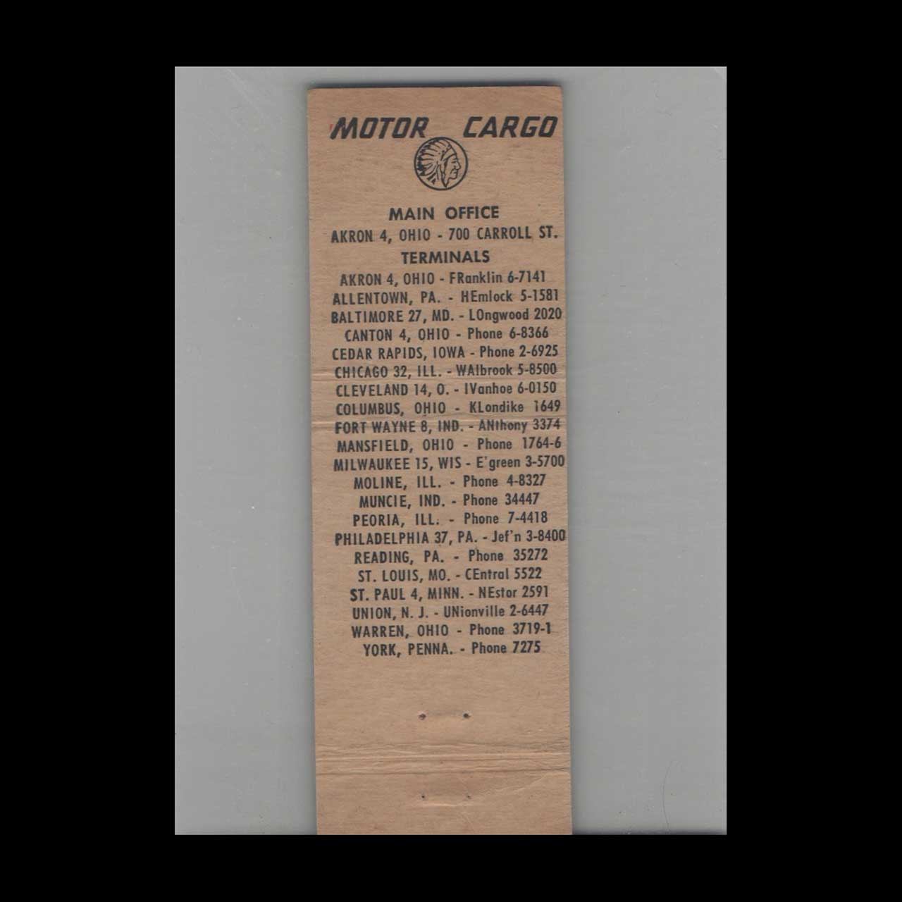Motor Cargo Truck Line of Akron, OH, a key player in mid-century freight transport. A nostalgic piece of Americana for vintage matchbook collectors.