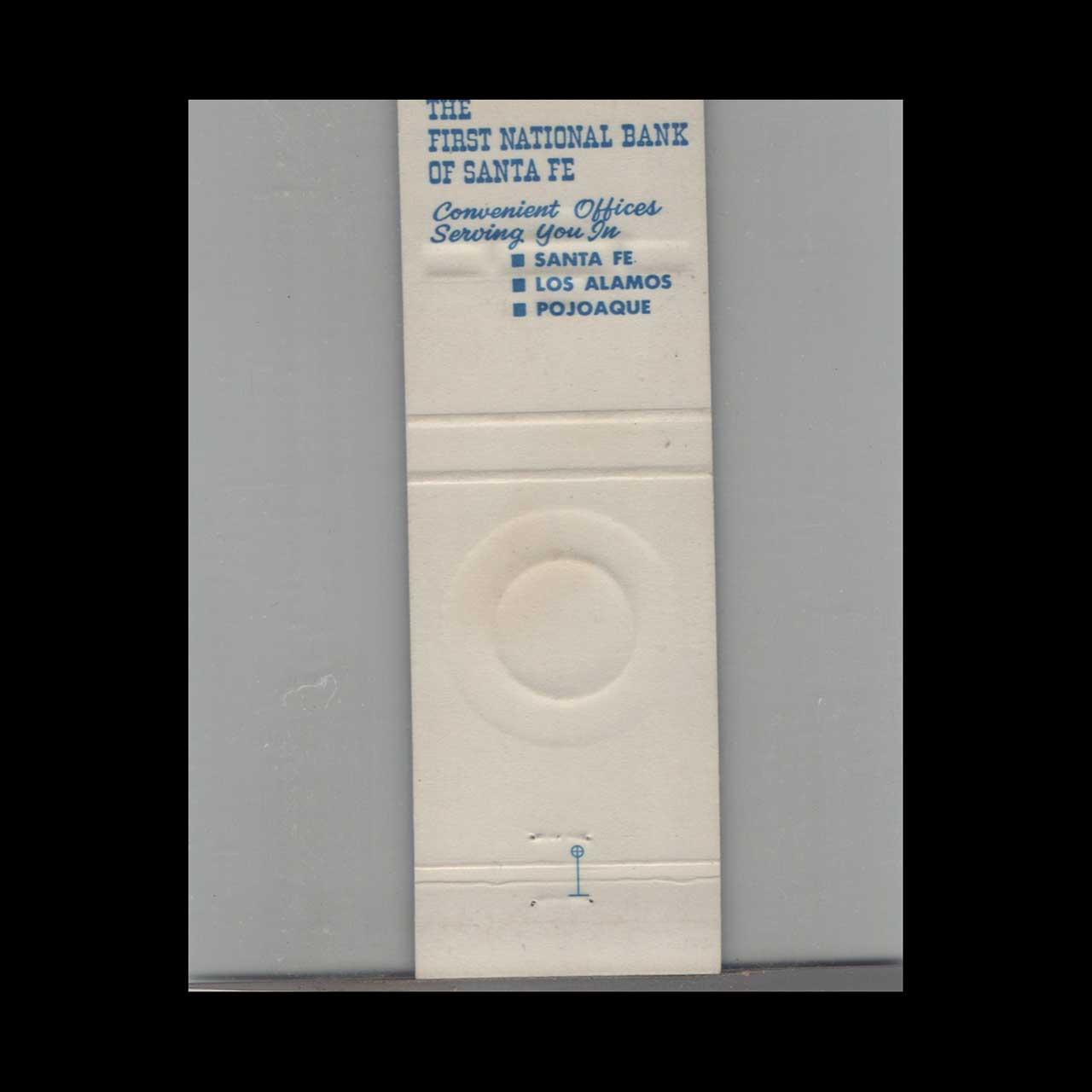The First National Bank of Santa Fe, adorned with Native American imagery, reflects Southwestern heritage and financial history. A nostalgic piece of Americana for collectors and vintage ephemera enthusiasts.