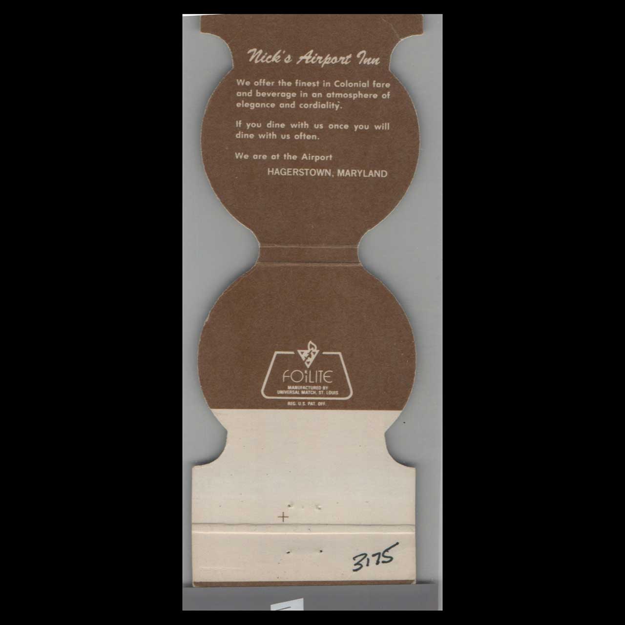Nick’s Airport Inn in Hagerstown, MD, was a beloved local dining and social spot near the airport. This die-cut matchbook cover is a classic ephemera relic cherished by Americana collectors.