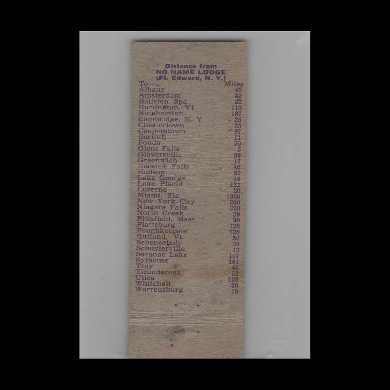 Discover No Name Lodge & Texaco Gas Station in Glens Falls, NY, a historic roadside stop blending hospitality and service. This vintage matchbook is a nostalgic piece of Americana for collectors.