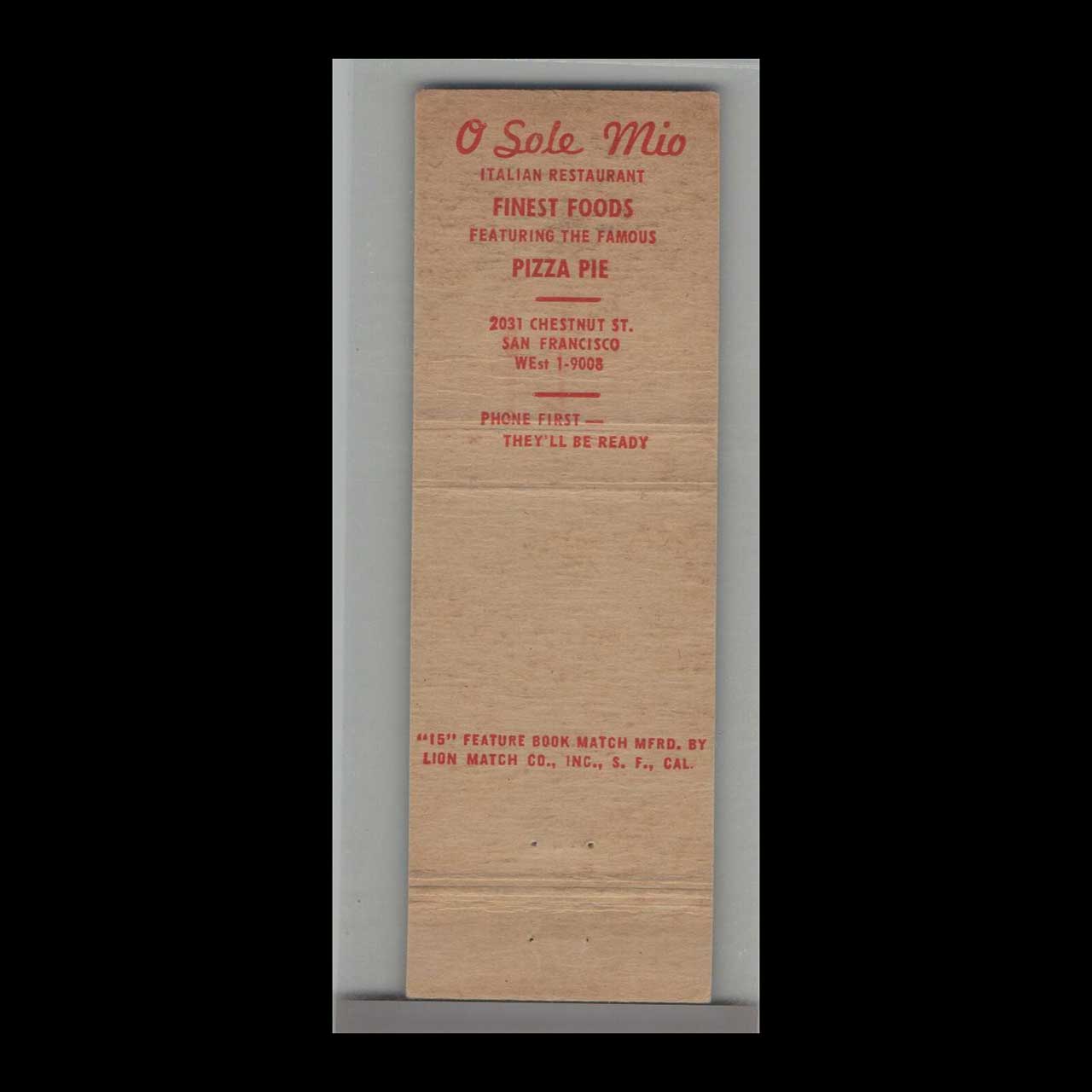 O-Sole-Mio Italian Restaurant Matchbook Cover San Francisco