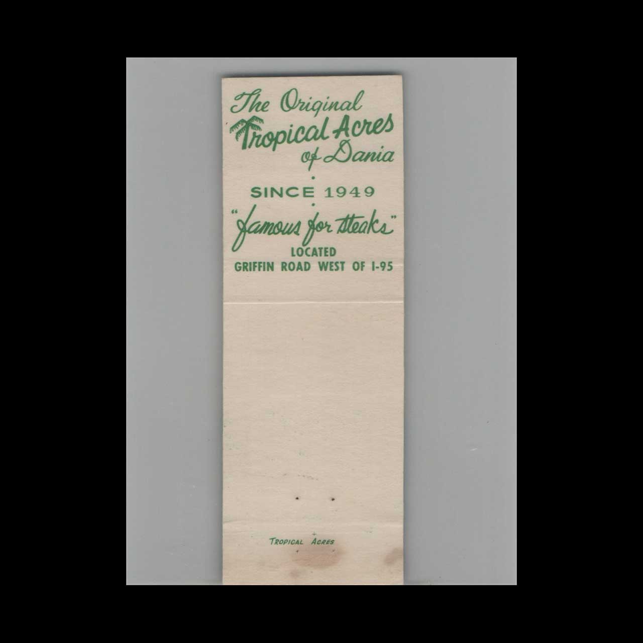 Original Tropical Acres Steak House Matchbook Cover Ft. Lauderdale
