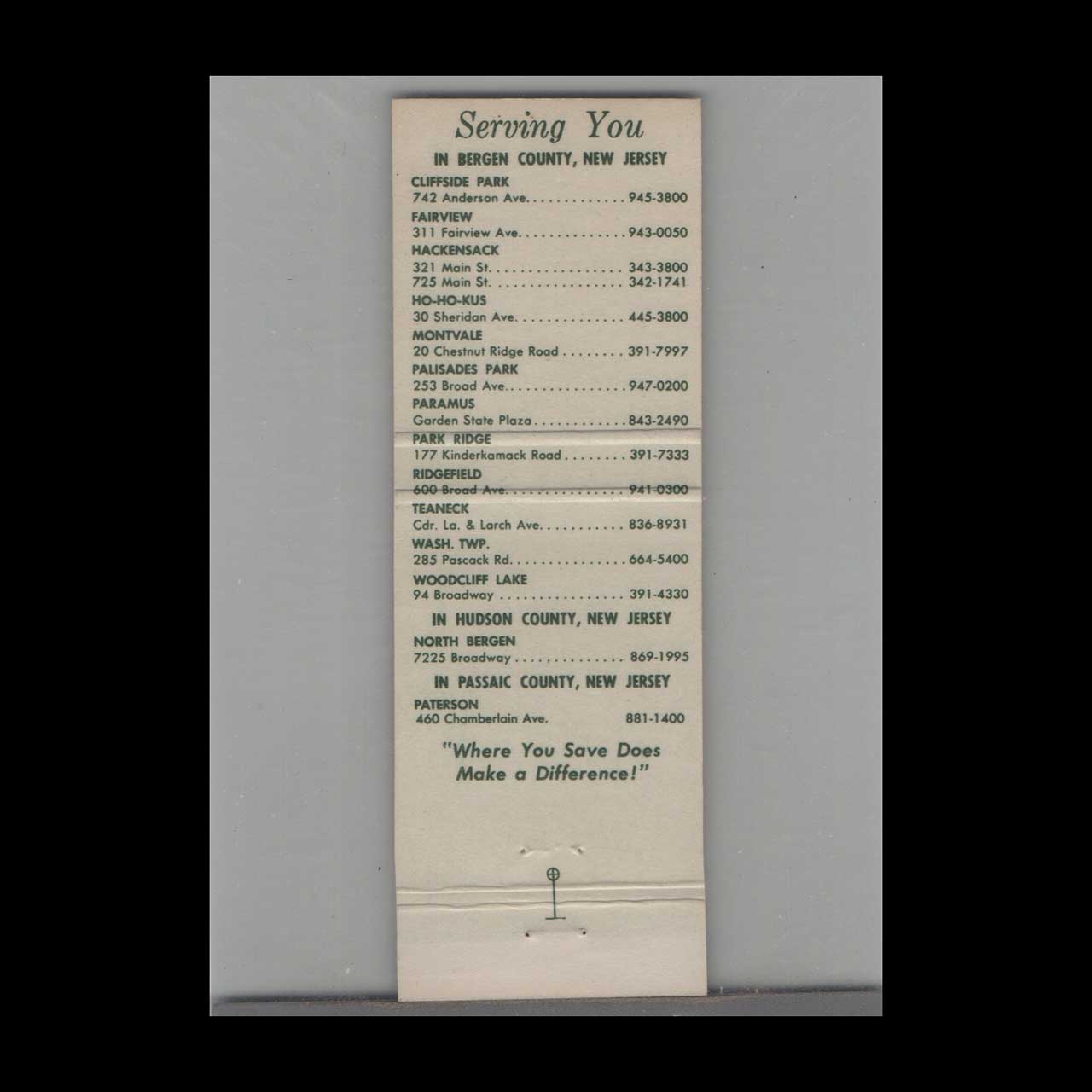 Oritani Savings & Loan Matchbook Cover Patterson NJ