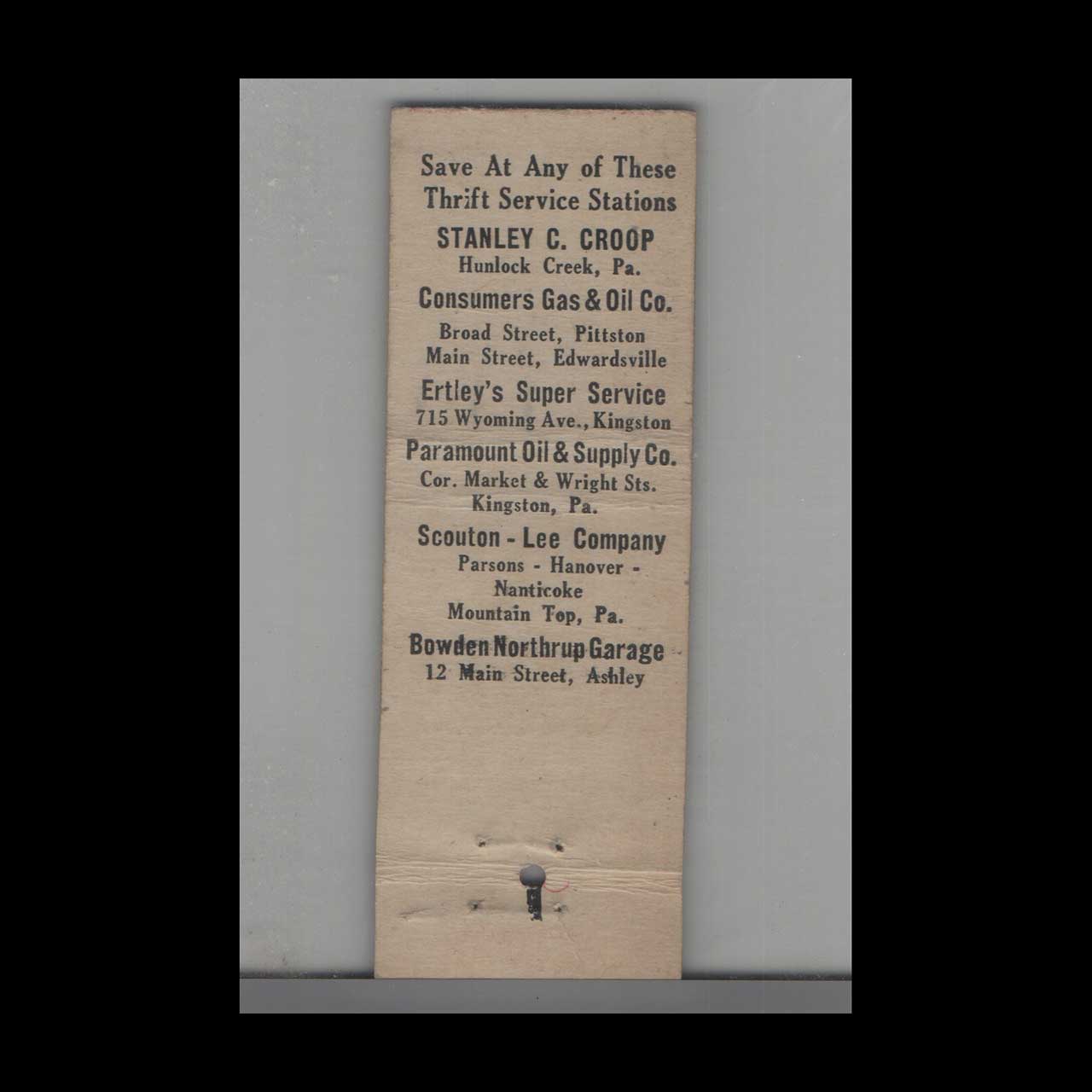Paramount Oil & Supply Co. and Kelly Tires in Kingston, PA, served motorists with quality fuel and tire services. This vintage matchbook is a classic ephemera relic cherished by Americana collectors.