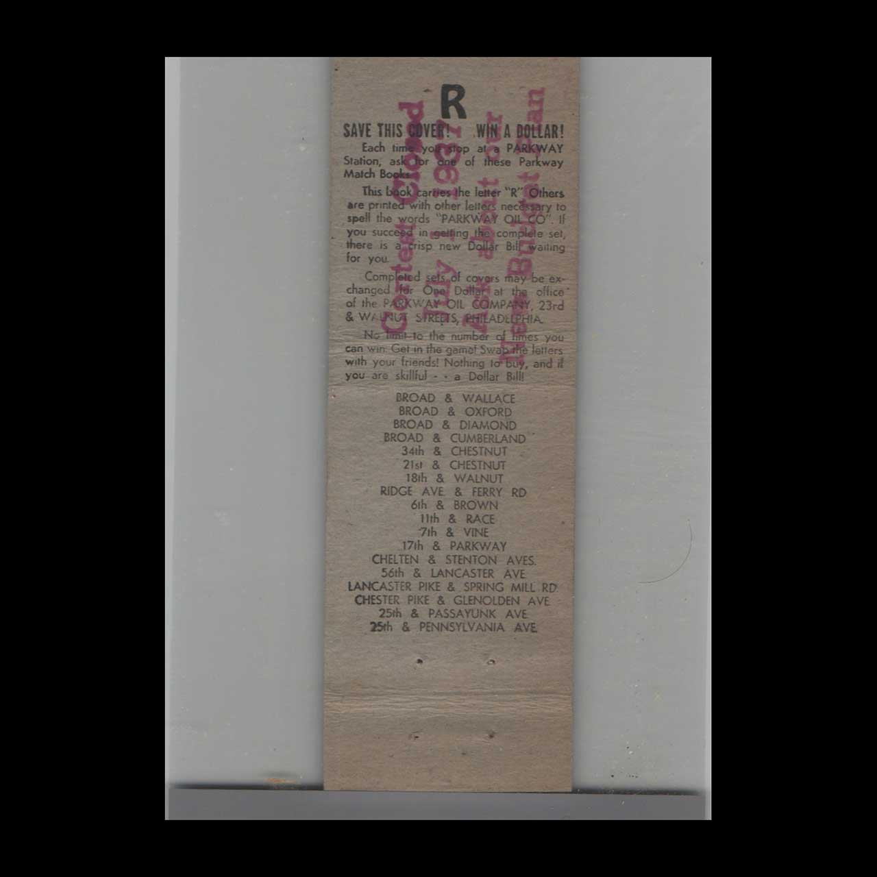 Parkway Oil Co Matchbook Cover 23rd Walnut St Philadelphia
