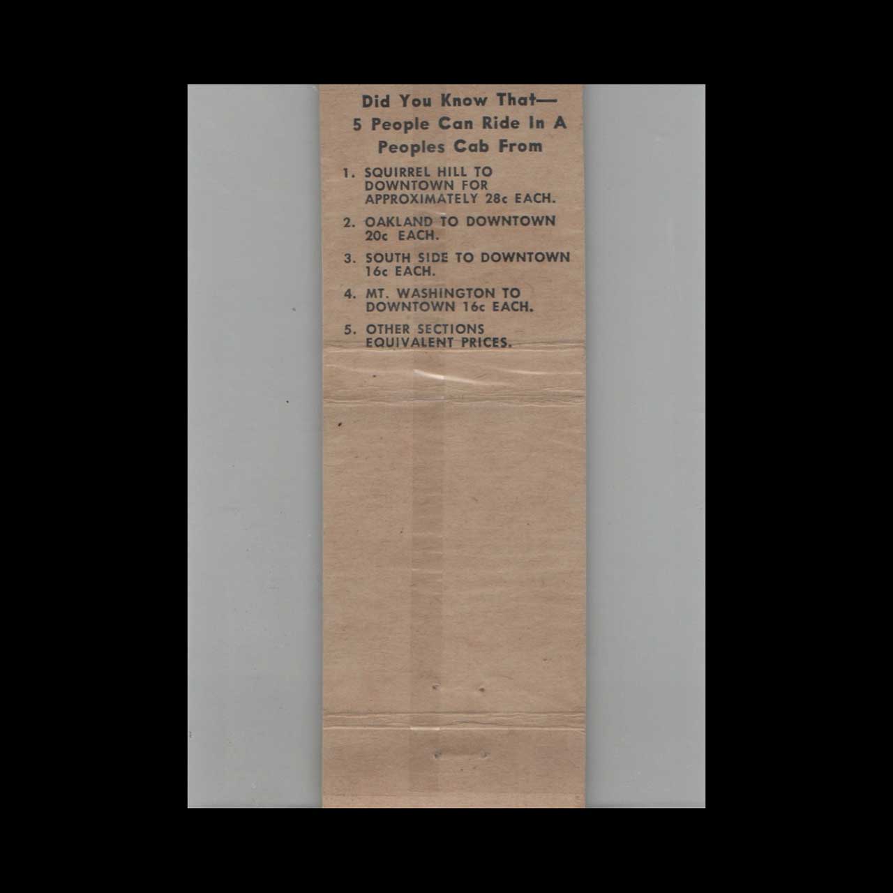 Peoples Cab Company Matchbook Cover Pittsburgh PA