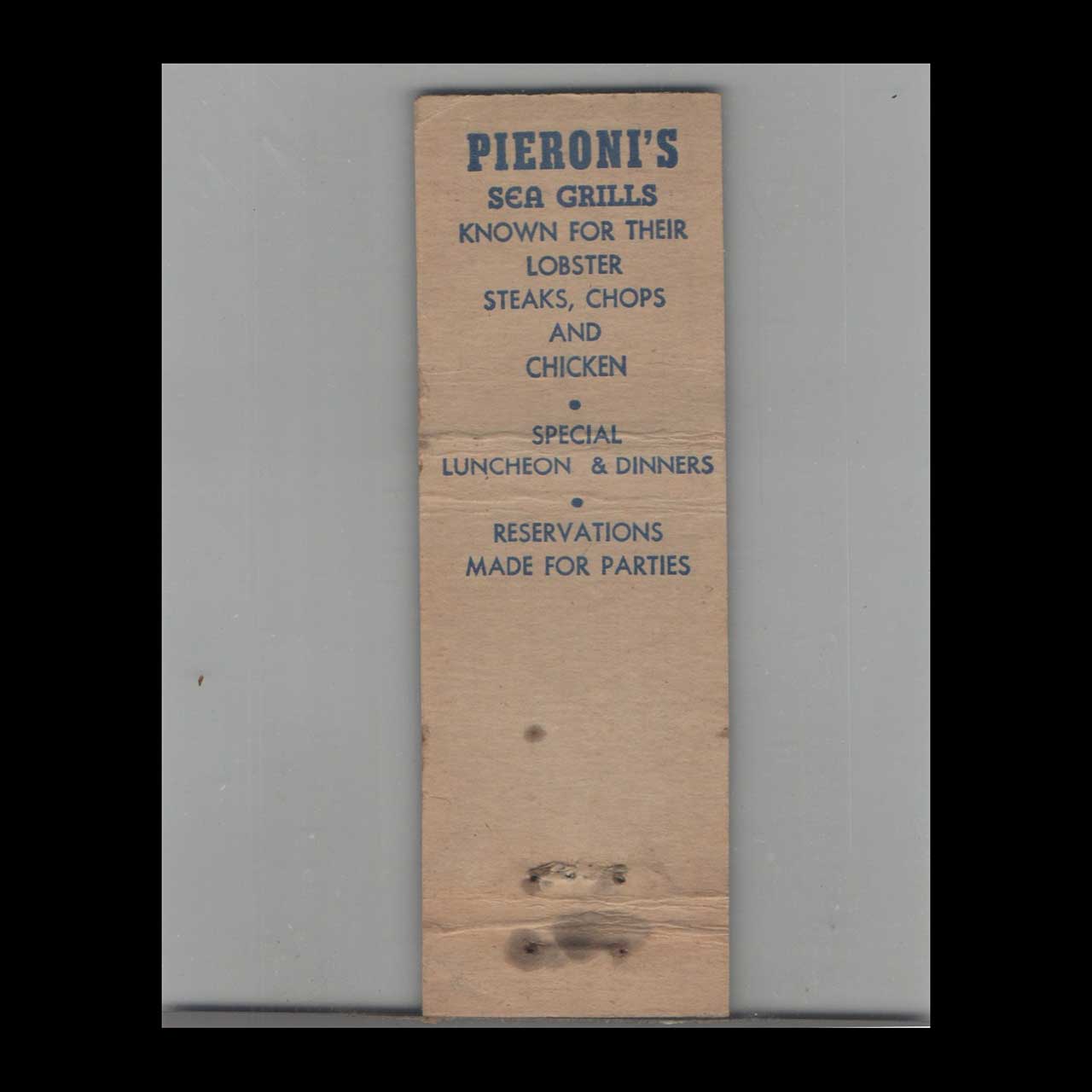 Peroni’s Sea Grills in Boston, MA, offered a vibrant dining experience with coastal-inspired cuisine. This vintage matchbook is a classic ephemera relic cherished by Americana collectors.