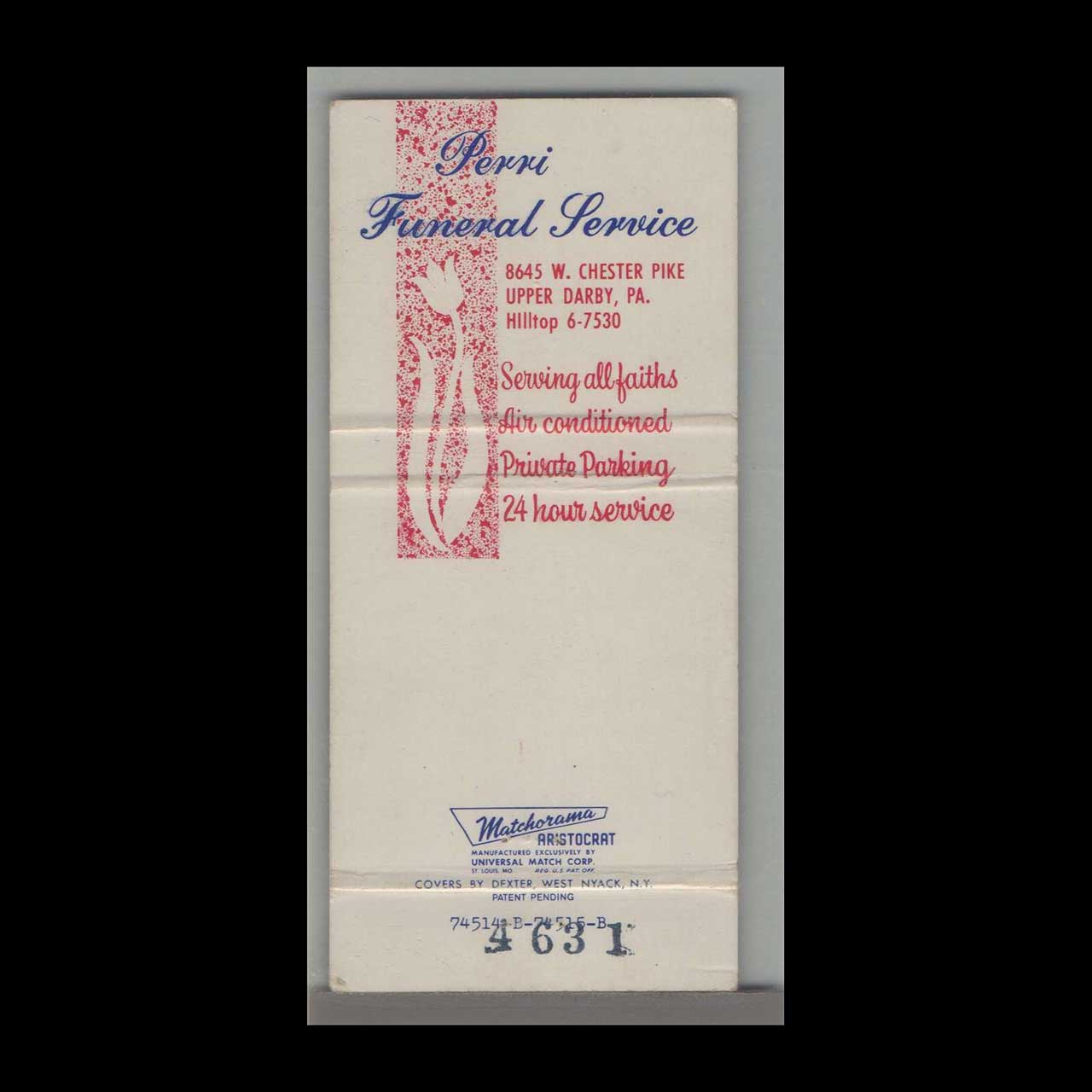 Perri Funeral Service in Upper Darby, PA, offered compassionate end-of-life care with dignity and respect. This vintage matchbook is a classic ephemera relic cherished by Americana collectors.