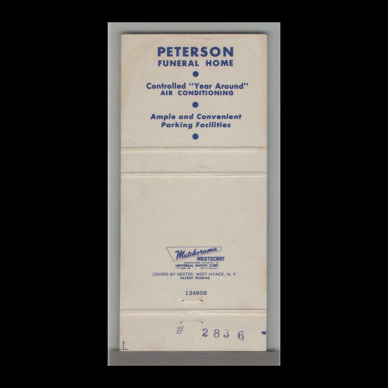 Peterson Funeral Home in Chicago, IL, provided compassionate funeral services with dignified care. This vintage matchbook is a classic ephemera relic cherished by Americana collectors.