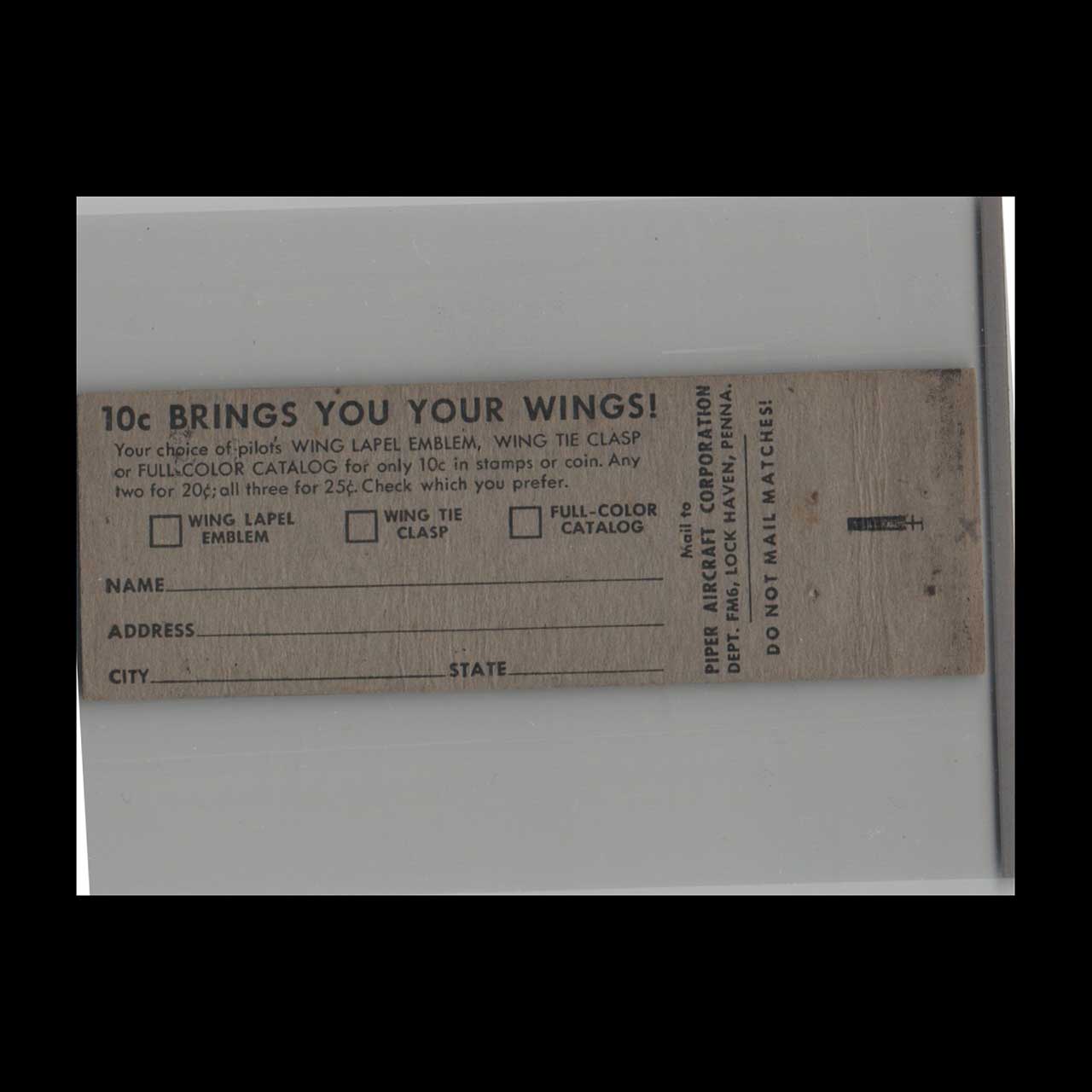 Piper Points Matchbook Cover Wings for All Americans