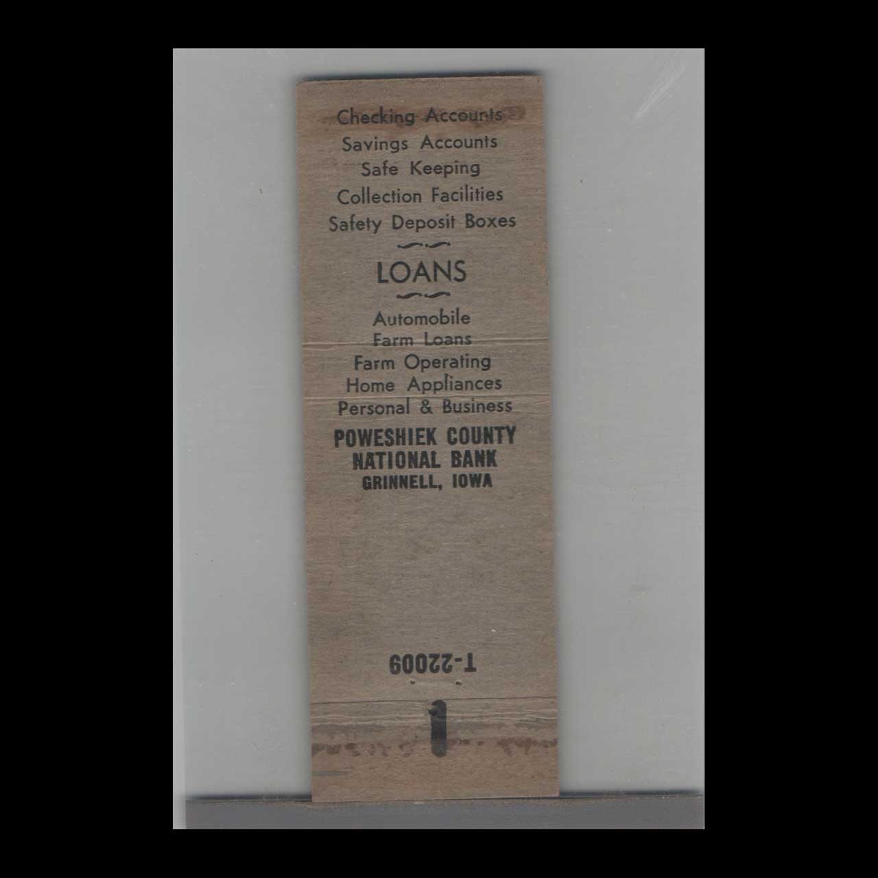 Poweshiek County National Bank Matchbook Cover Grinnell IA