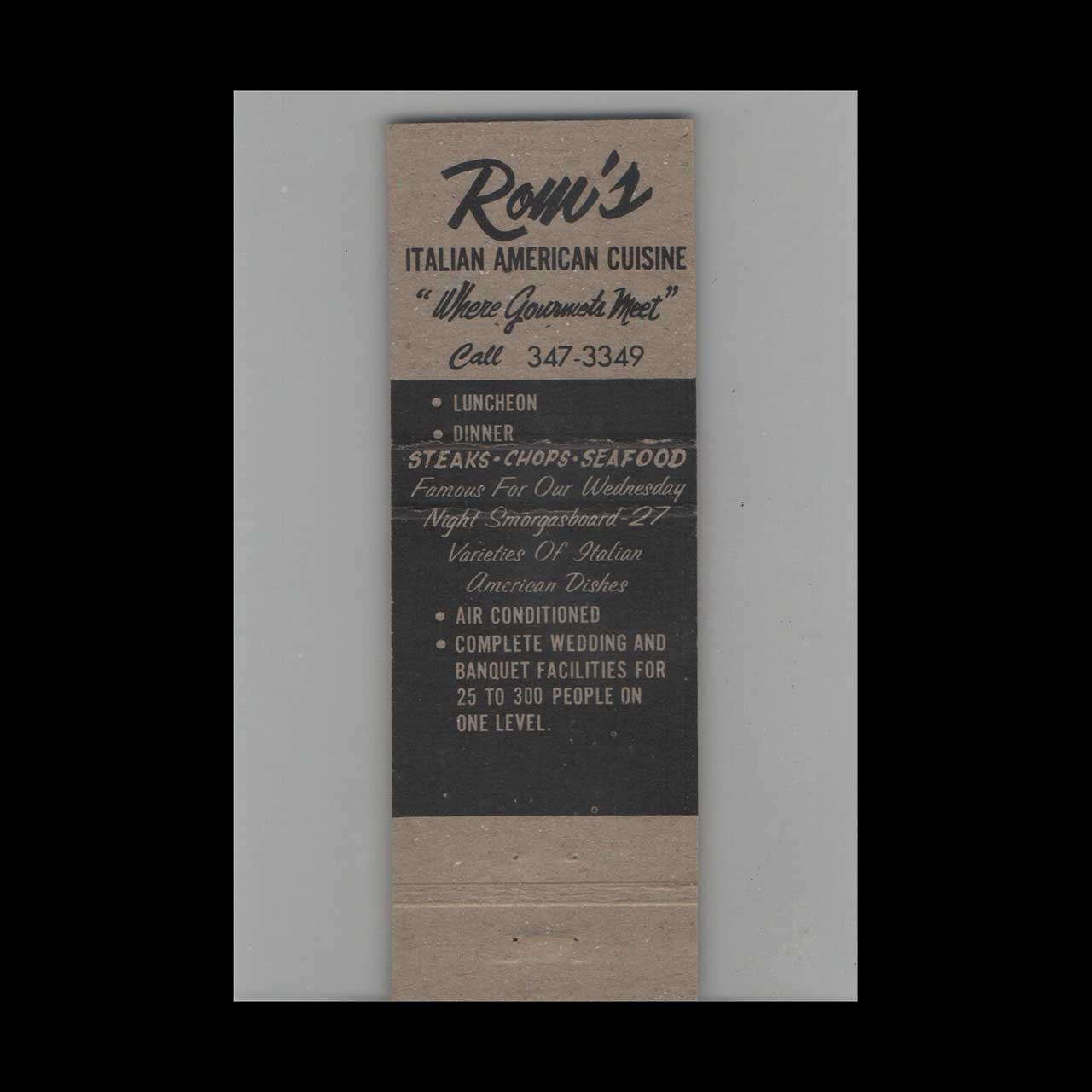 Rom’s Broasted Chicken in Sturbridge, MA, served classic comfort food with a hometown charm. This matchbook cover is a nostalgic piece of Americana for collectors.