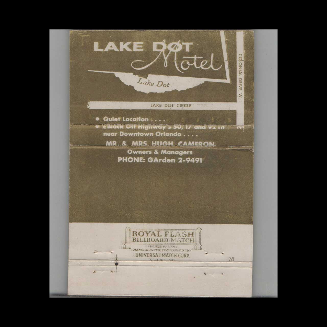 Royal Flash Lake Dot Motel Orlando Matchbook Cover