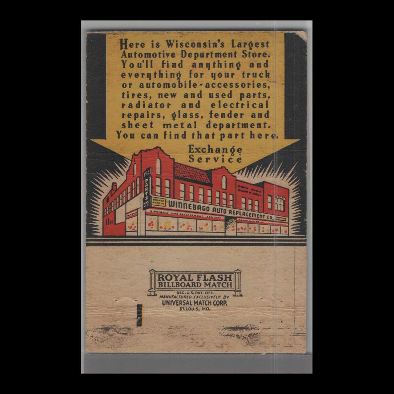 Royal Flash Winnebago Auto Replacement Co. in Beloit, WI, specialized in quality automotive parts and service. A classic ephemera relic cherished by vintage matchbook collectors.
