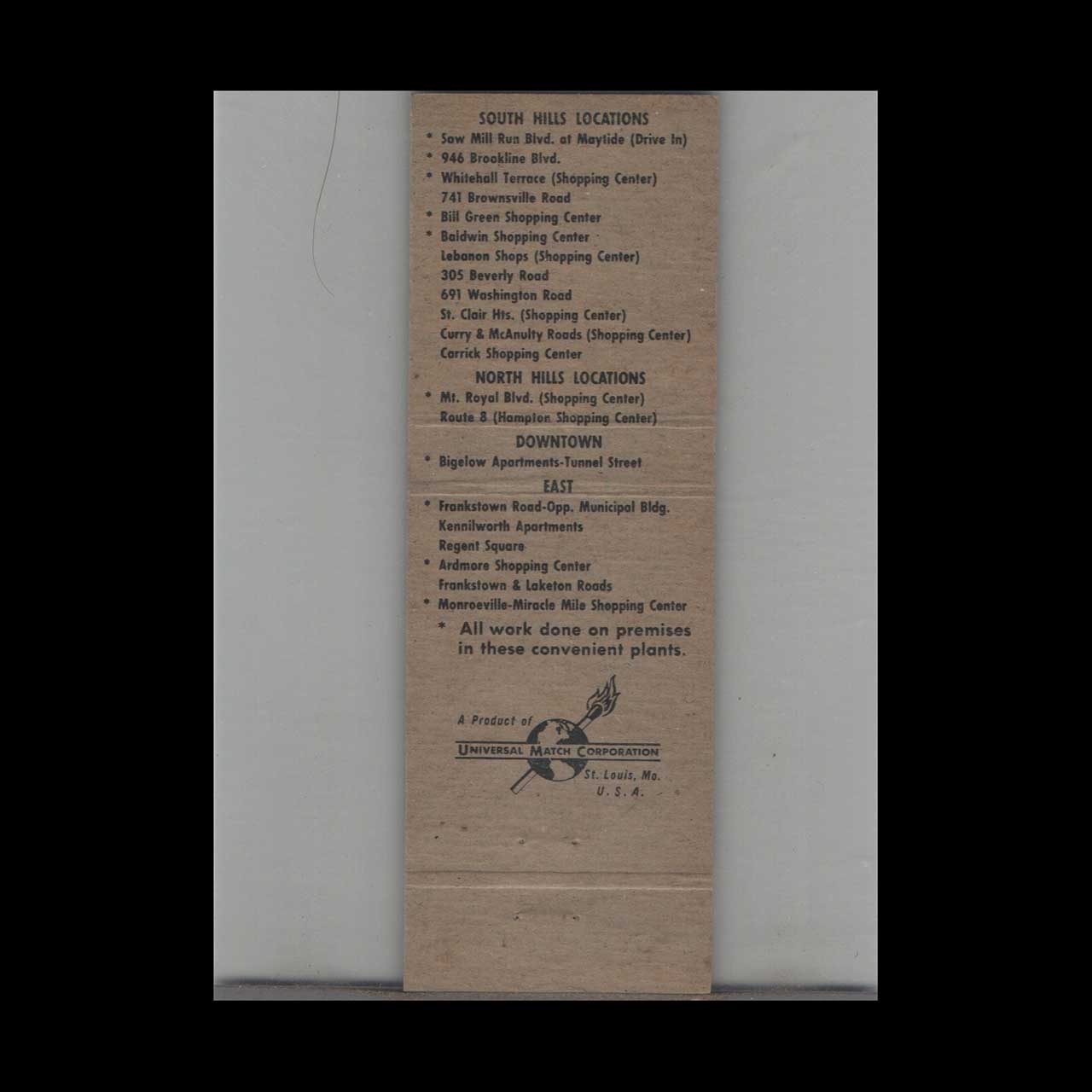 Ruby’s 1 Hour Dry Cleaning Service Matchbook Cover Pittsburgh