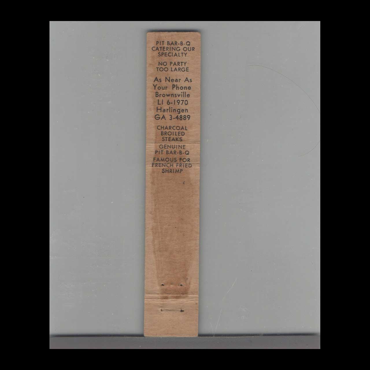 Sammy’s Charcoal Broiled Steaks in Brownsville, TX, served up hearty, flame-grilled favorites in a welcoming Texas setting. This 10-strike matchbook cover is a nostalgic piece of Americana for collectors and vintage ephemera enthusiasts.