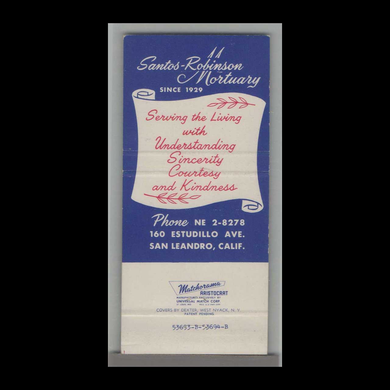 Santos Robinson Mortuary in San Leandro, CA, offered compassionate funeral services with dignified care. This vintage matchbook is a classic ephemera relic cherished by Americana collectors.