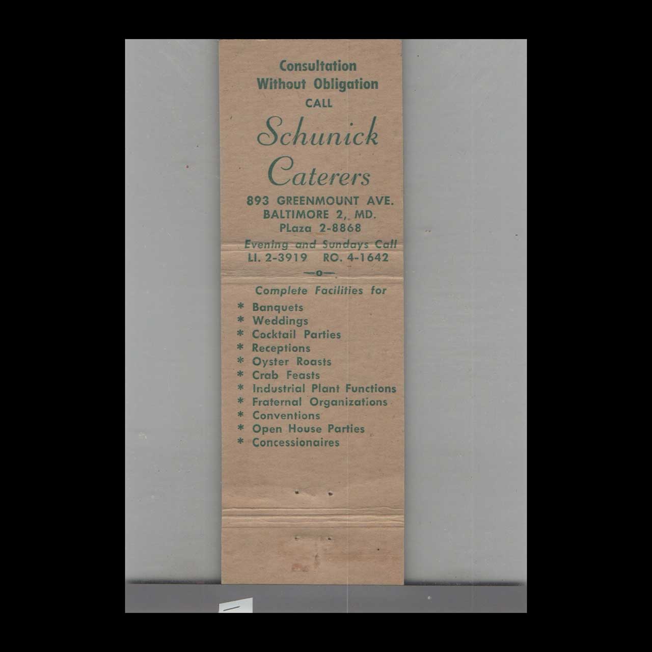 Schunick Caterers of Baltimore, MD, offered elegant event dining with a touch of mid-century charm. This vintage matchbook is a classic ephemera relic cherished by Americana collectors.