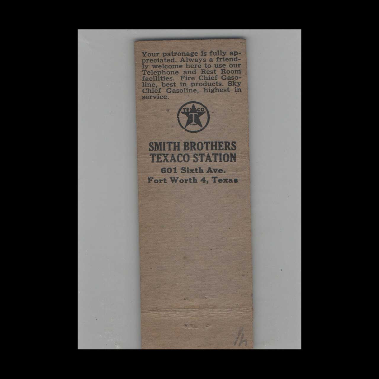 Smith Bros Texaco Gas Station Fort Worth TX Matchbook Cover