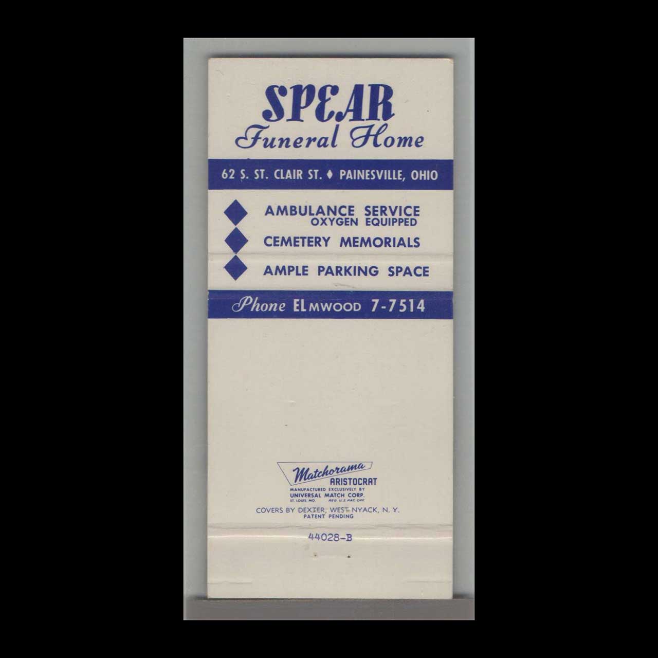 Spear Funeral Home in Painesville, OH, provided compassionate funeral services with dignity and care. This vintage matchbook is a classic ephemera relic cherished by Americana collectors.