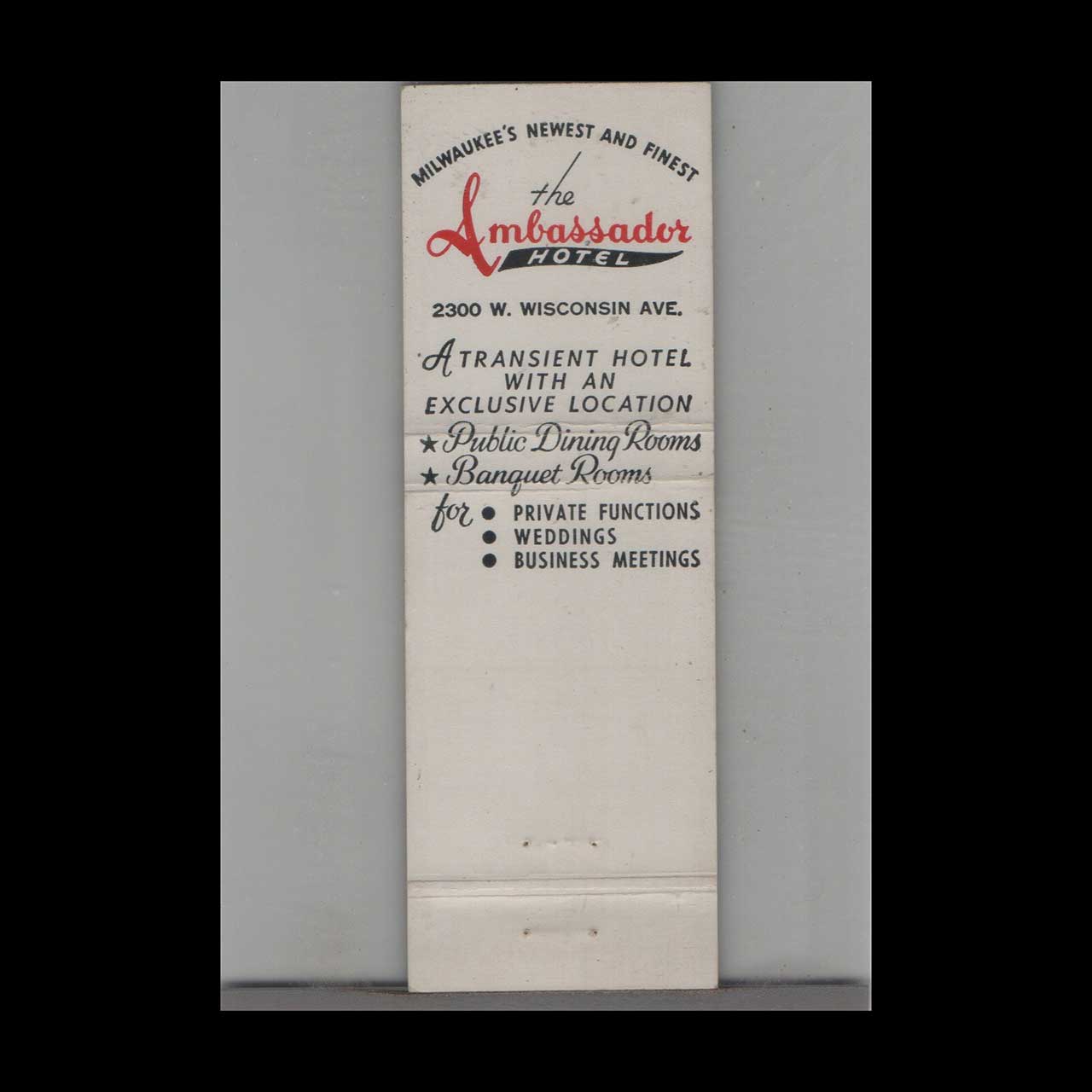 Discover the iconic Ambassador Hotel in Milwaukee, WI, a historic landmark known for its elegant charm. This stripped feature matchbook is a classic ephemera relic cherished by Americana collectors.