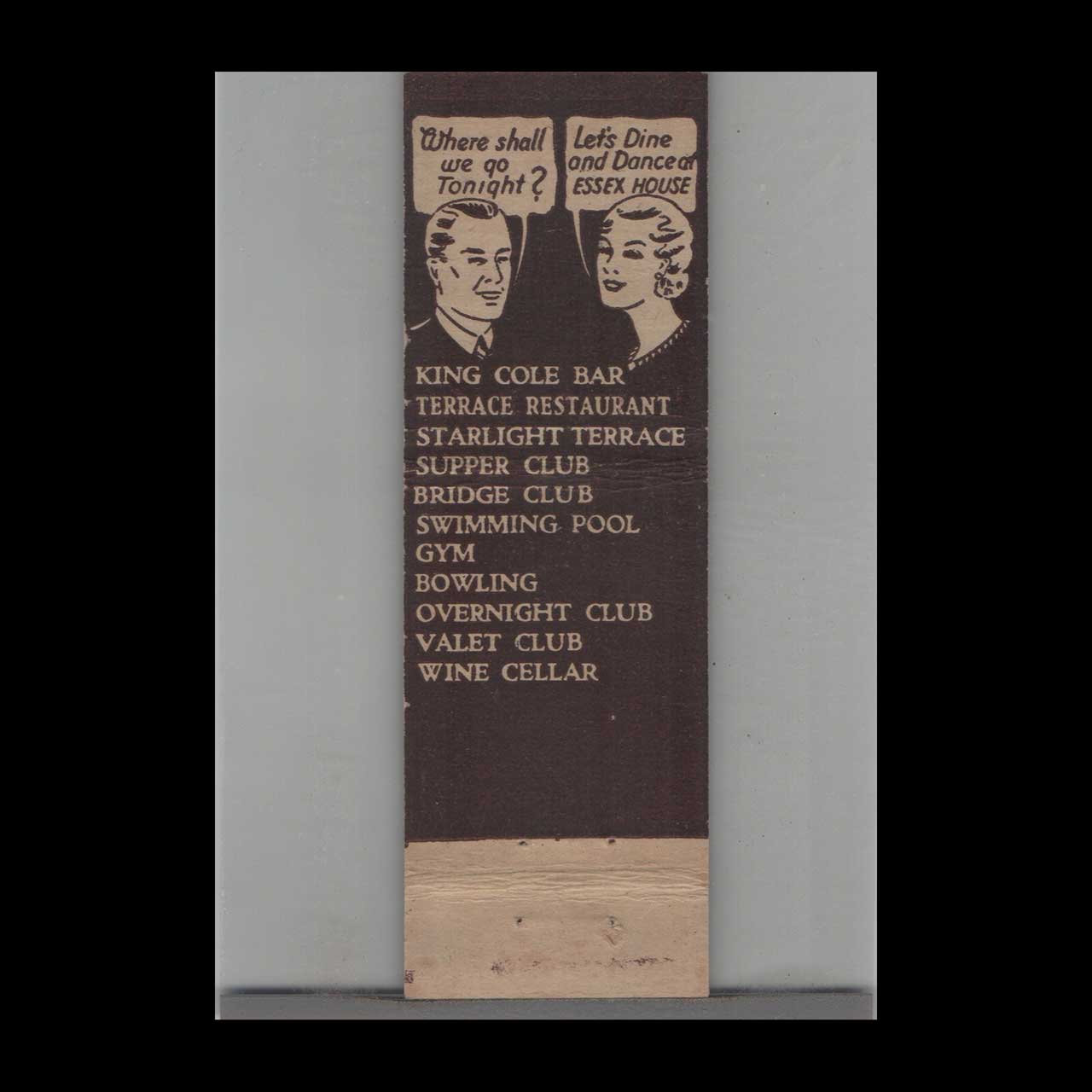 Stripped Feature Essex House in Newark, NJ, was a notable mid-century entertainment venue. This vintage matchbook is a classic ephemera relic cherished by Americana collectors.