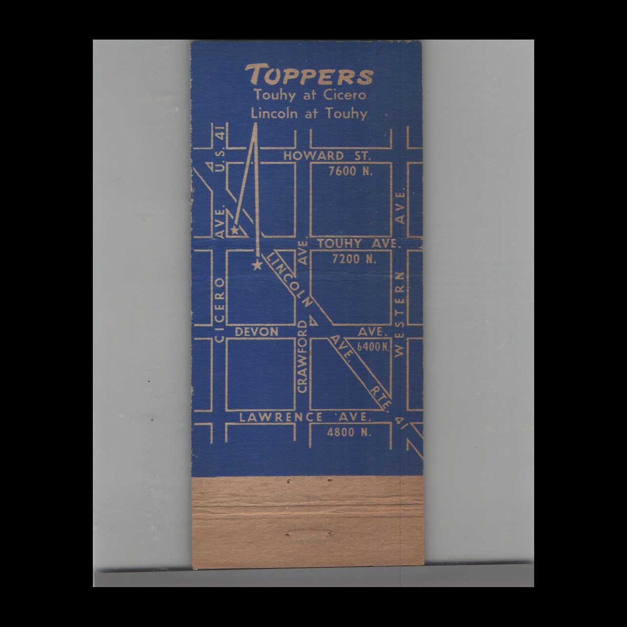 Stripped Feature Toppers Drive-In in Lincolnwood, IL, was a beloved mid-century outdoor cinema destination. This vintage matchbook is a classic ephemera relic cherished by Americana collectors.