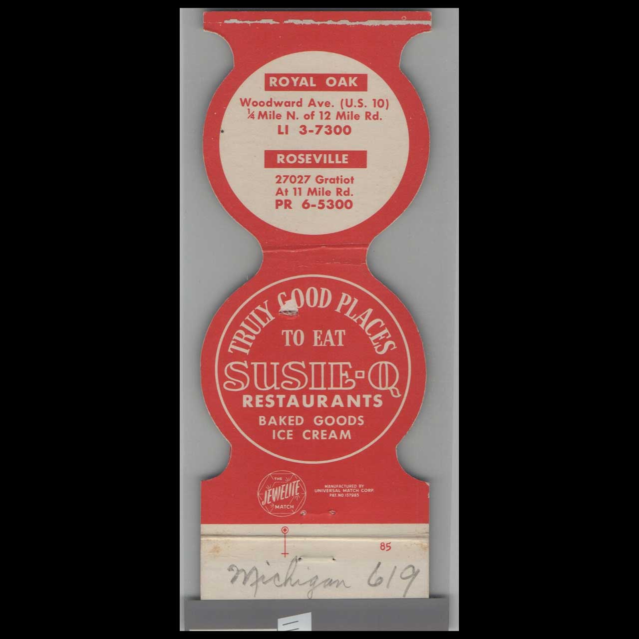 Susie Fish & Chips in Royal Oak, MI, served classic seafood delights in a charming local setting. This die-cut matchbook is a nostalgic piece of Americana for collectors.