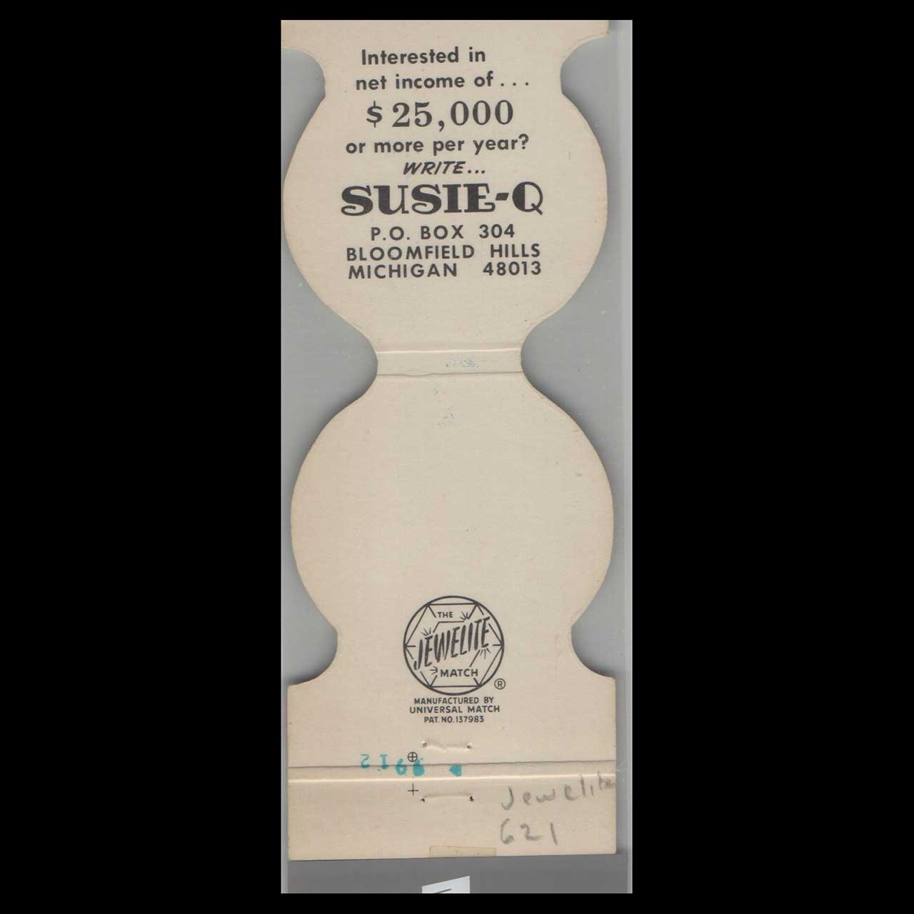 Susie-Q World’s Best Fish & Chips in Bloomfield Hills, MI, served iconic American seafood favorites with hometown charm. This vintage matchbook is a classic ephemera relic cherished by Americana collectors.