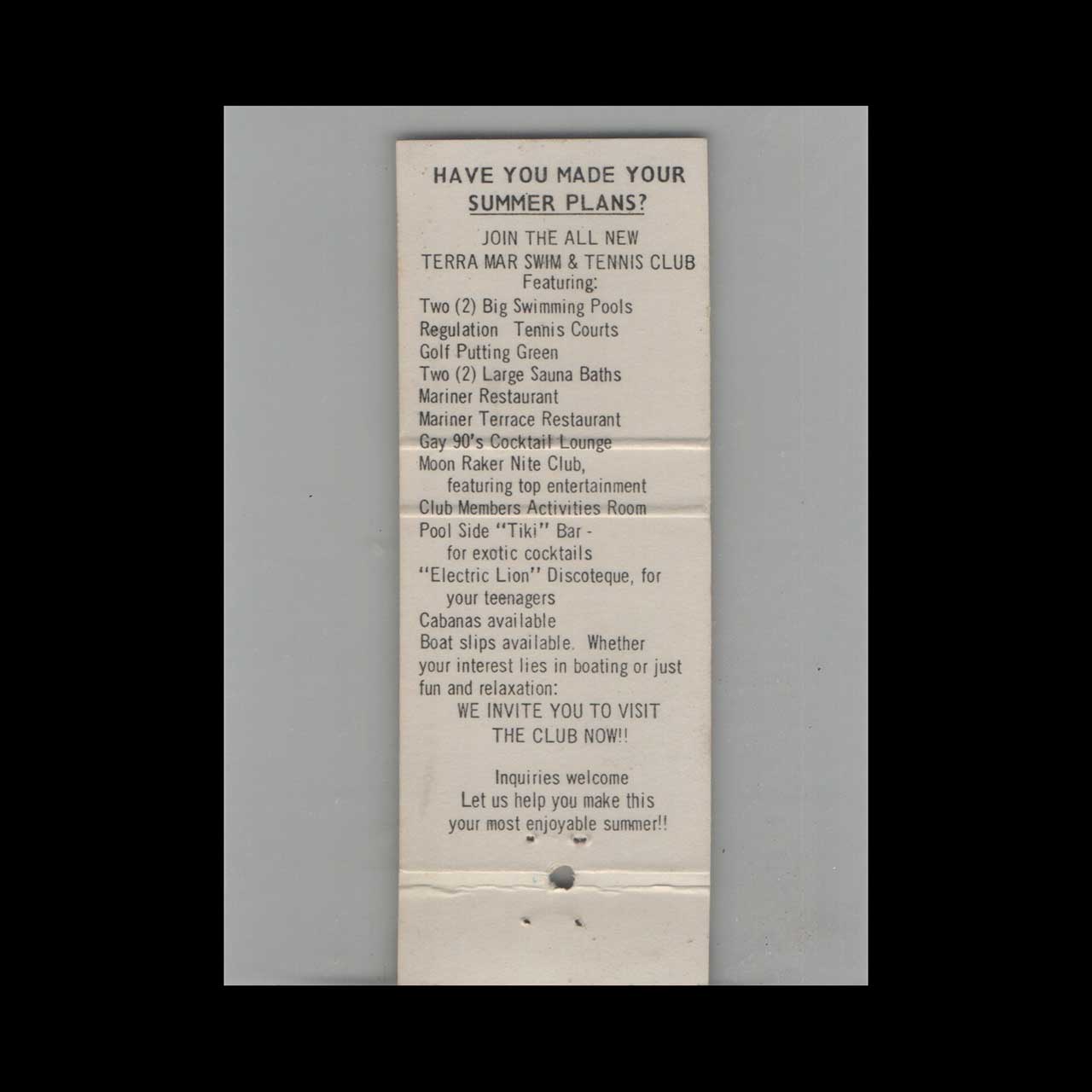 Terra Mar Yacht & Tennis Club in Old Saybrook, CT, epitomizes coastal leisure and upscale recreation. This vintage matchbook is a classic ephemera relic cherished by Americana collectors.