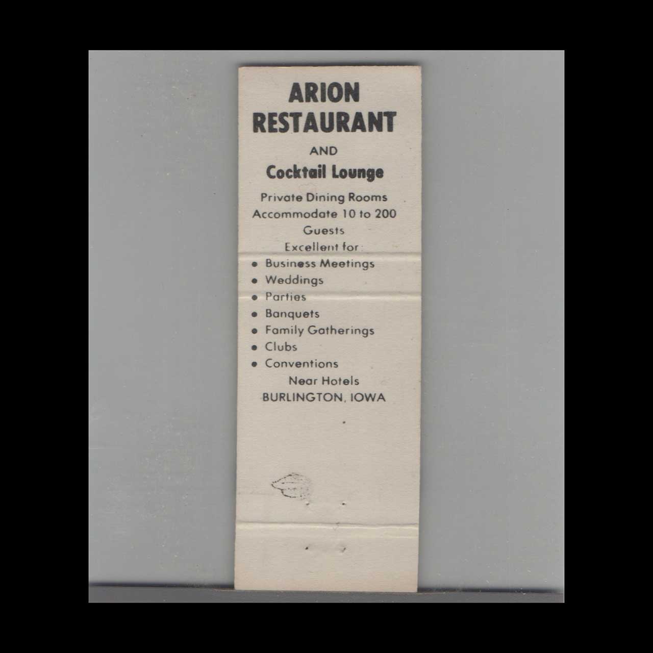 The Arion Fine Foods Burlington IA Matchbook Cover
