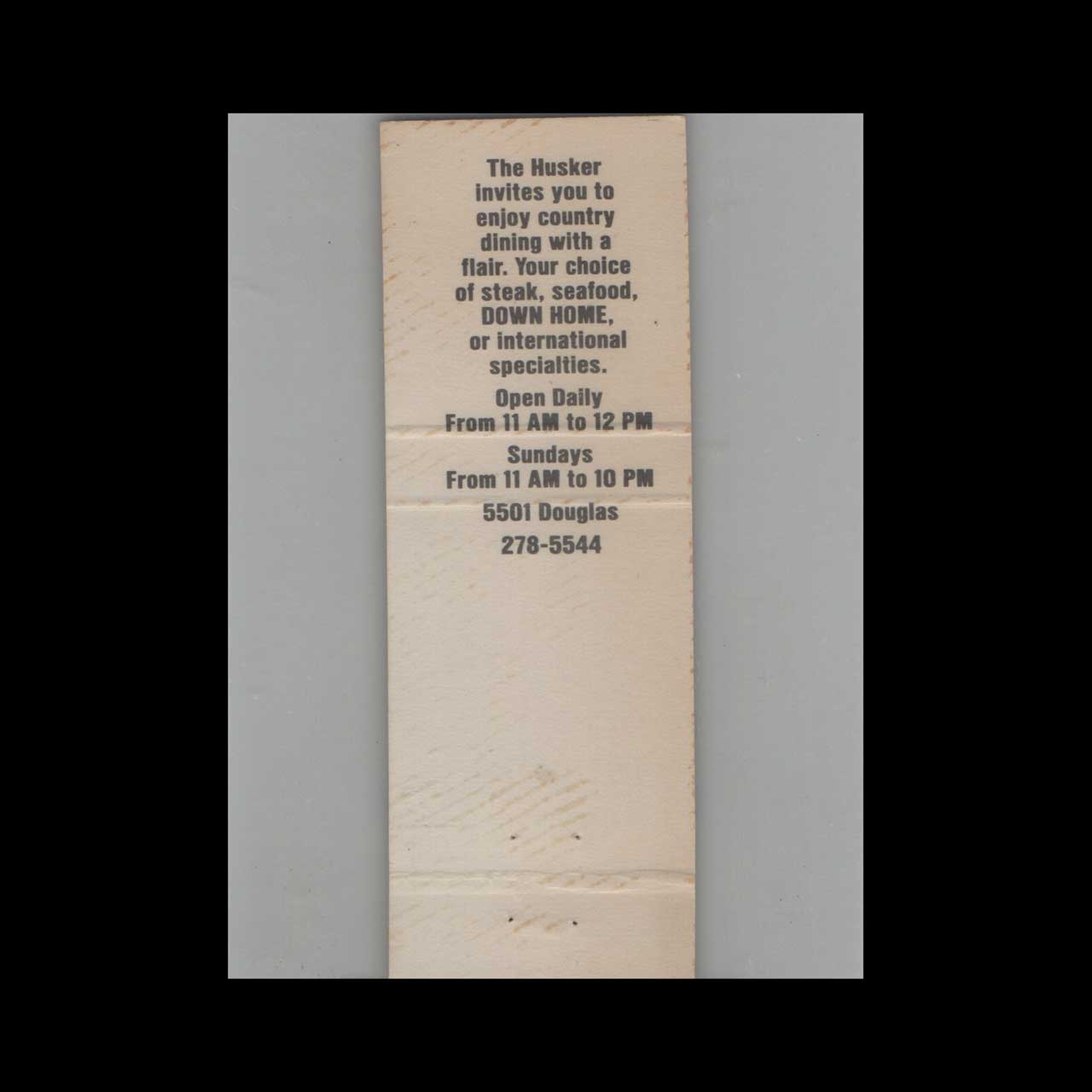 The Husker Food & Spirits in Des Moines, IA, offered a welcoming Midwestern dining and drinking experience. This vintage matchbook is a classic ephemera relic cherished by Americana collectors.