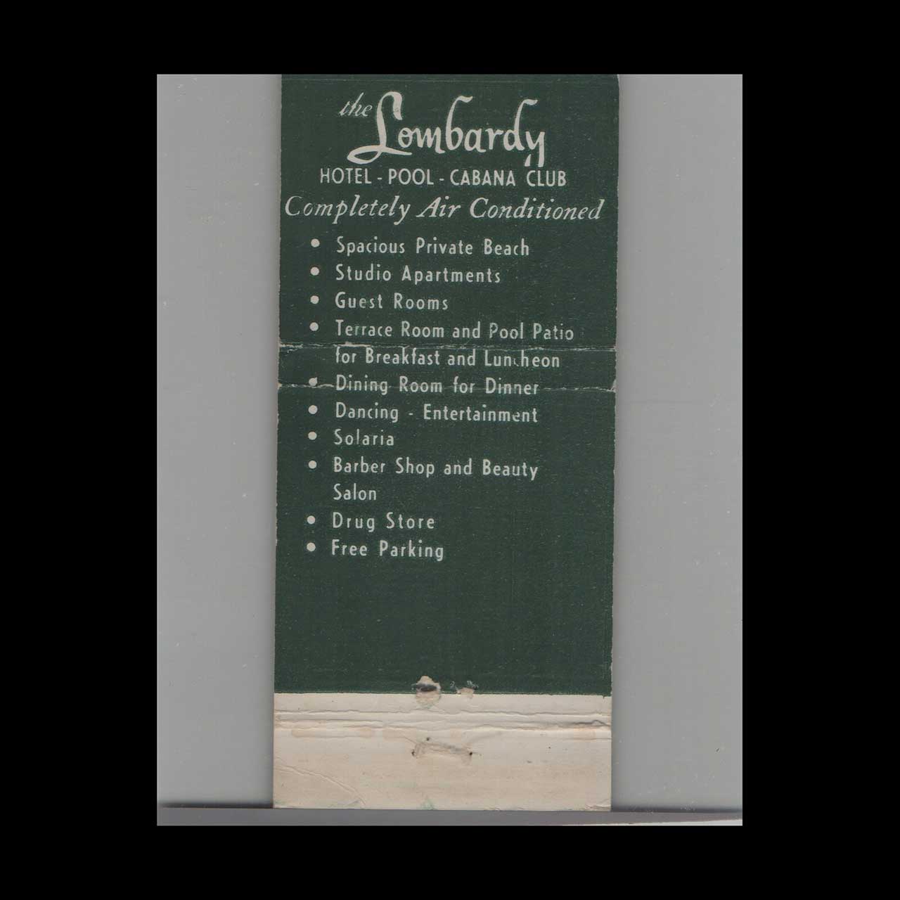The Lombardy Hotel in Miami Beach, FL, epitomizes mid-century coastal elegance and vibrant hospitality. This stripped matchbook cover is a classic ephemera relic cherished by Americana collectors.