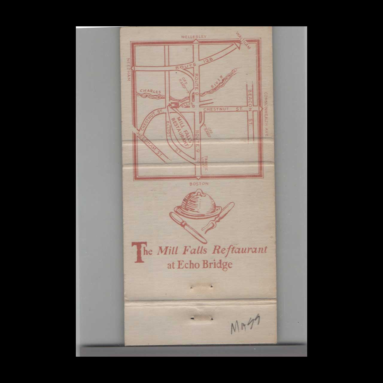 The Mils Falls Restaurant at Echo Bridge in Newton Upper Falls, MA, offered charming dining with scenic river views. A nostalgic piece of Americana for collectors and vintage ephemera enthusiasts.