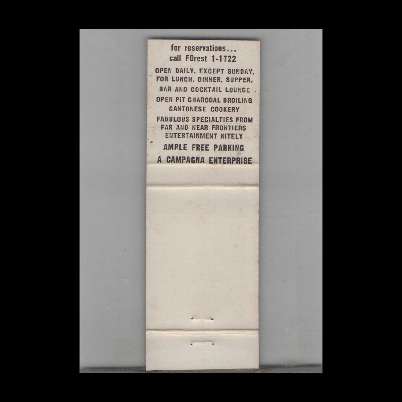 The Montclair Hotel Frontier Room in St. Louis, MO, epitomized mid-century elegance and hospitality. This vintage matchbook is a nostalgic piece of Americana for collectors.