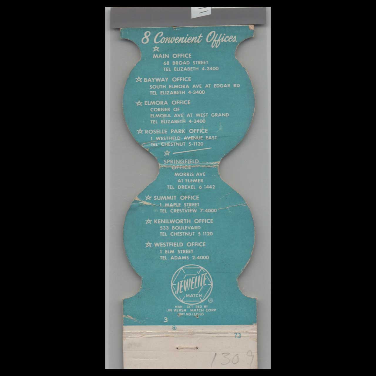 The National State Bank of Elizabeth, NJ, served as a trusted financial institution in its community. This die-cut matchbook cover is a nostalgic piece of Americana for collectors.