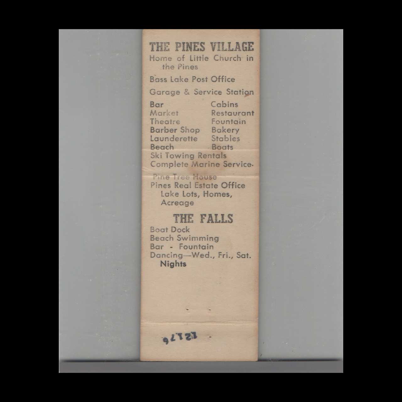 The Pines Williams Resorts Bass Lake Matchbook Cover
