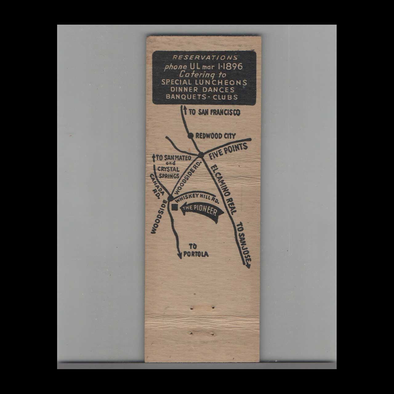 The Pioneer Restaurant Woodside Matchbook Cover