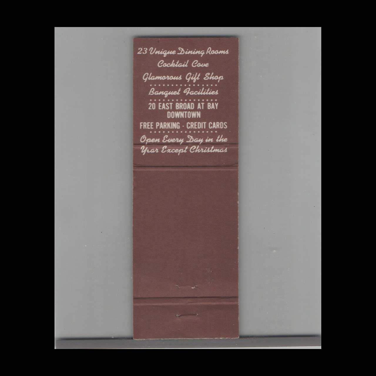 The Pirates’ House Restaurant in Savannah, GA, is a historic dining landmark known for its colonial charm and Southern cuisine. This vintage matchbook is a classic ephemera relic, cherished by Americana collectors.