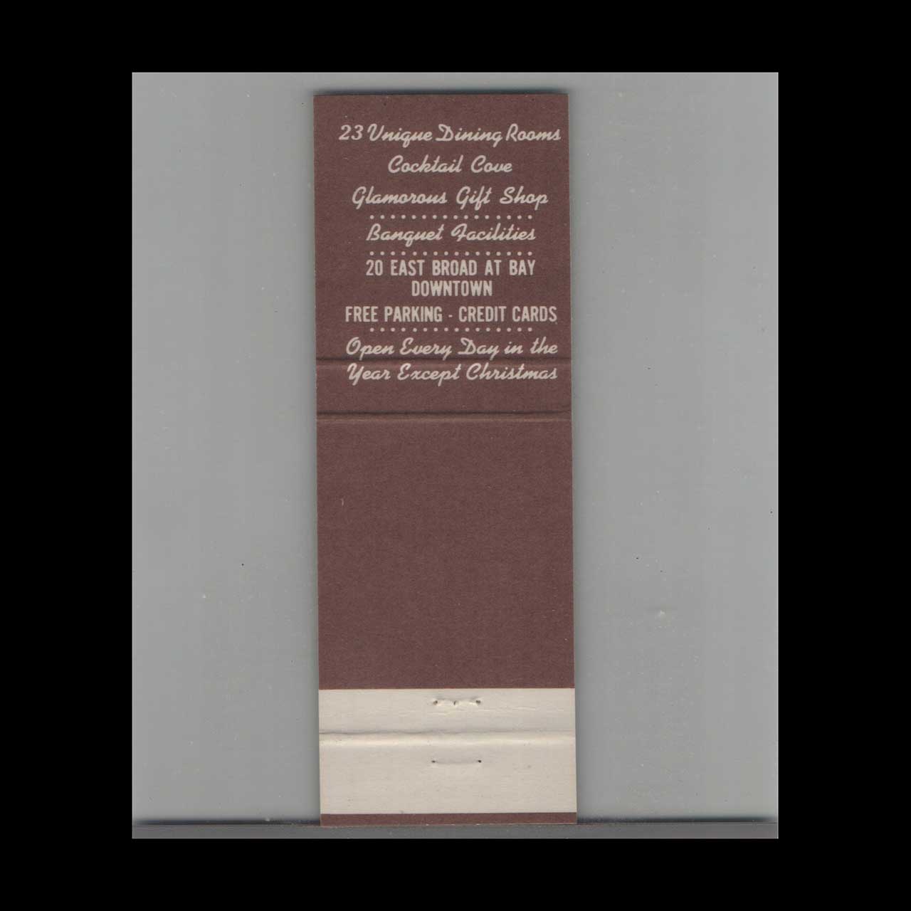 The Pirates’ House Restaurant in Savannah, GA, is a historic eatery famed for its colonial charm and Southern hospitality. This vintage matchbook cover is a classic ephemera relic cherished by Americana collectors.