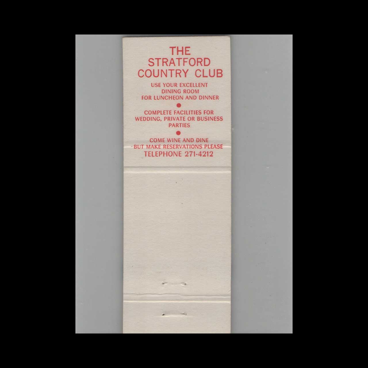 The Stratford Country Club in Stratford, ON, offers timeless elegance and leisure in a historic setting. A classic ephemera relic cherished by vintage matchbook collectors.