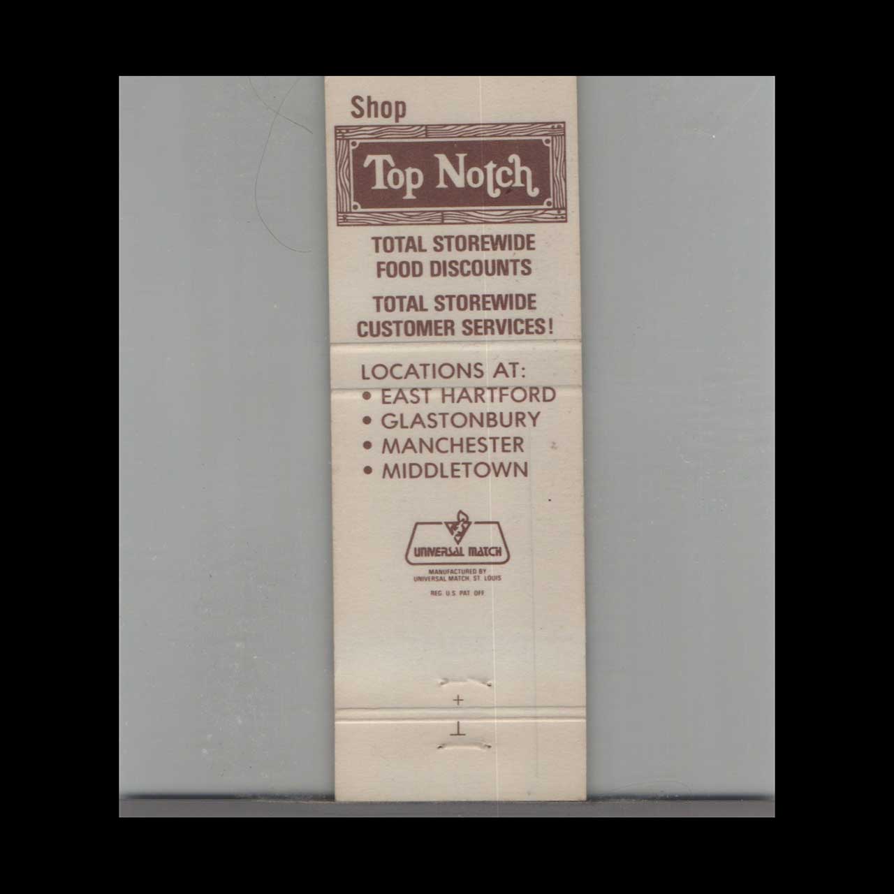 Top Notch Foods was a beloved Connecticut supermarket chain known for quality and community service. This vintage matchbook is a classic ephemera relic cherished by Americana collectors.