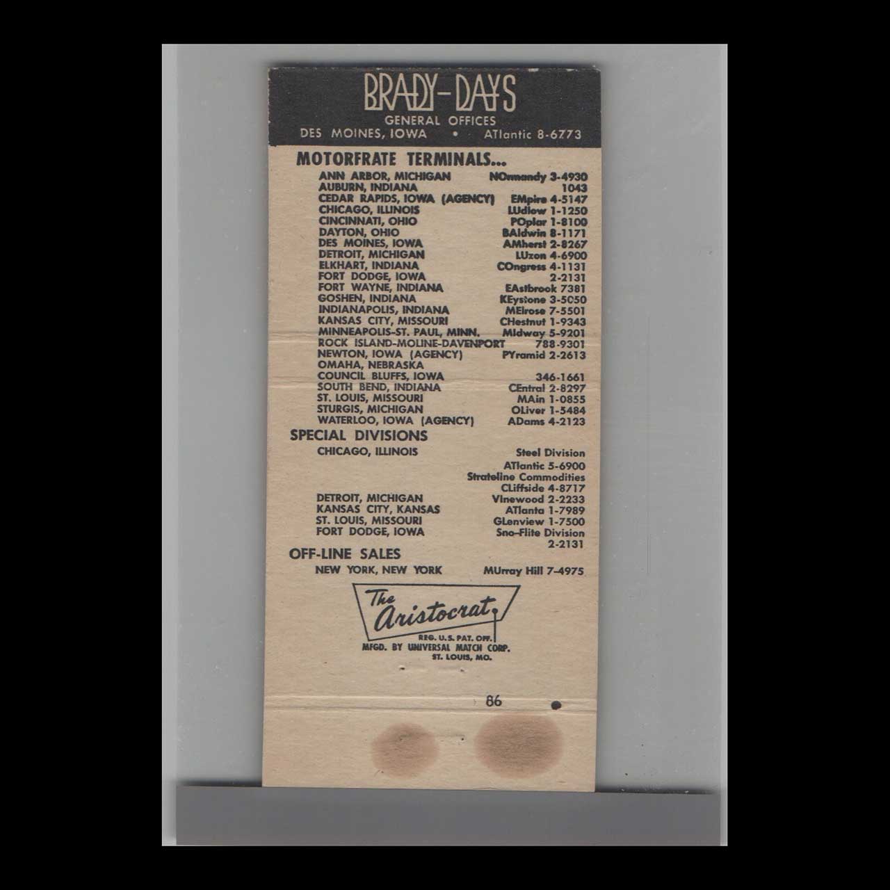 Trucking Brady Days LTL Service Matchbook Cover Des Moines
