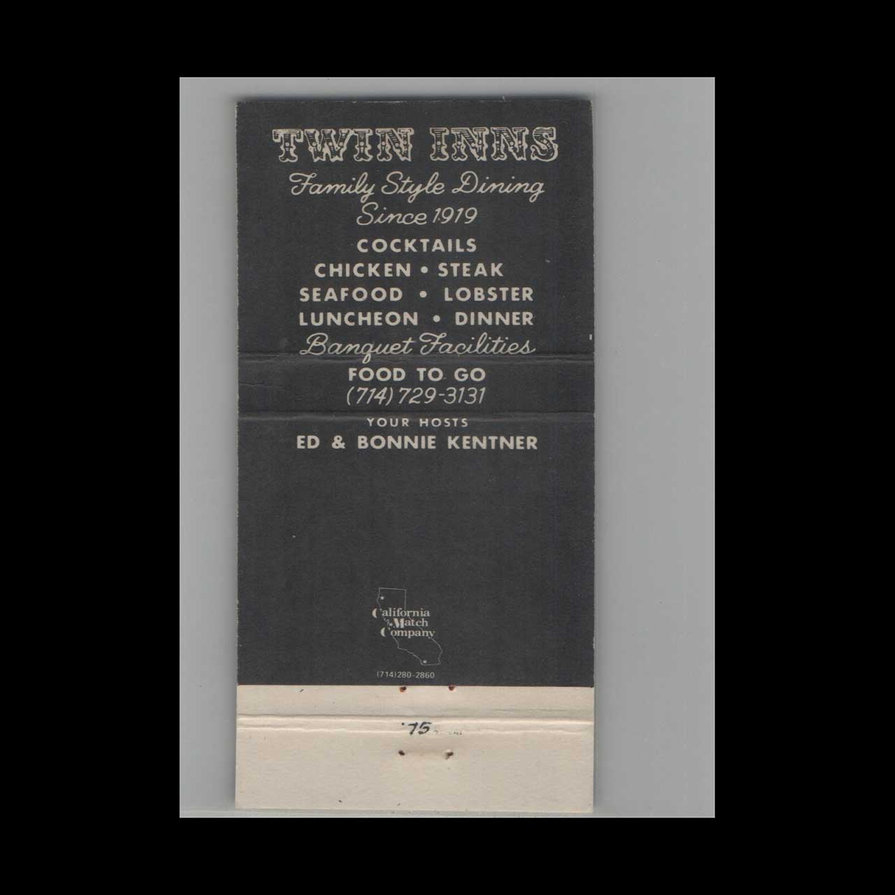 Twin Inns Steak & Lobster in San Diego, CA, offered classic surf and turf dining in a vibrant coastal setting. This matchbook is a nostalgic piece of Americana for collectors.