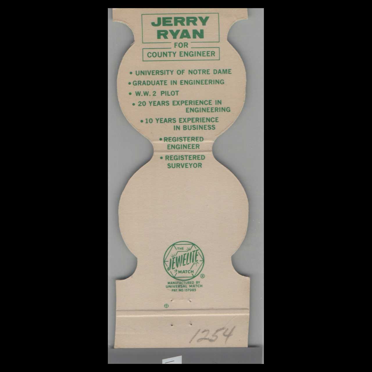Vote Jerome Ryan County Engineer 1972 Matchbook Cover