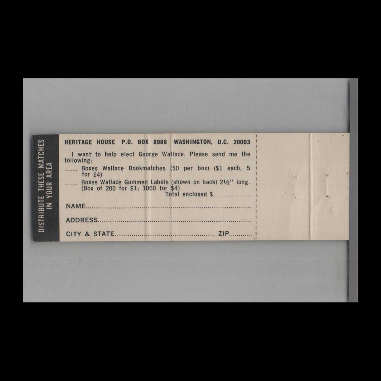 Wallace 1968 Campaign Matchbook Cover