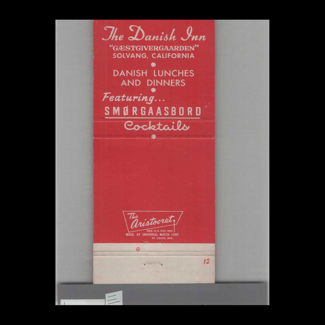 The Danish Inn Smorgasbord in Solvang, CA, offers authentic Scandinavian dining in a charming windmill setting. This vintage matchbook is a classic ephemera relic cherished by Americana collectors.
